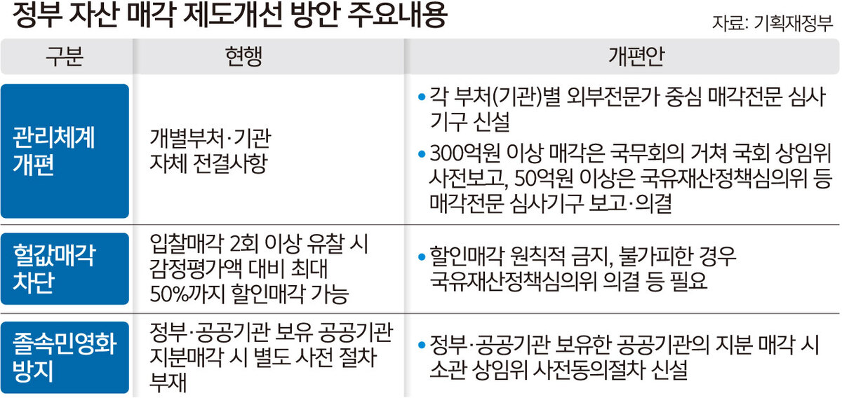앞으로 국가 자산의 매각은 국유재산정책심의위원회 등 외부전문가가 참여하는 매각전문 심사기구의 보고·의결을 거쳐 처분된다. 그간 개별 부처나 기관 자체 전결로 매각이 이뤄져 절차가 불투명하다는 지적이 많았는데, 외부 전문가 중심으로 별도 기구를 만들어 심사를 강화하겠다는 취지다. 헐값 매각 논란을 차단하기 위해 감정평가액보다 낮은 할인매각은 원칙적으로 금지된다.